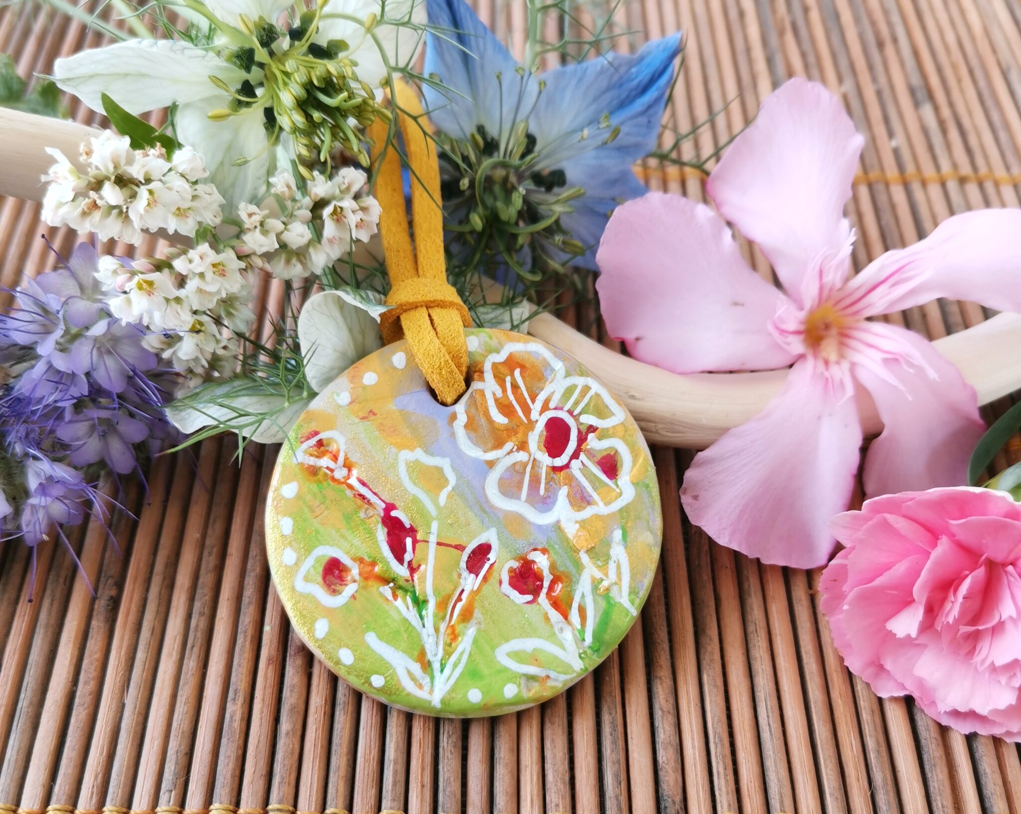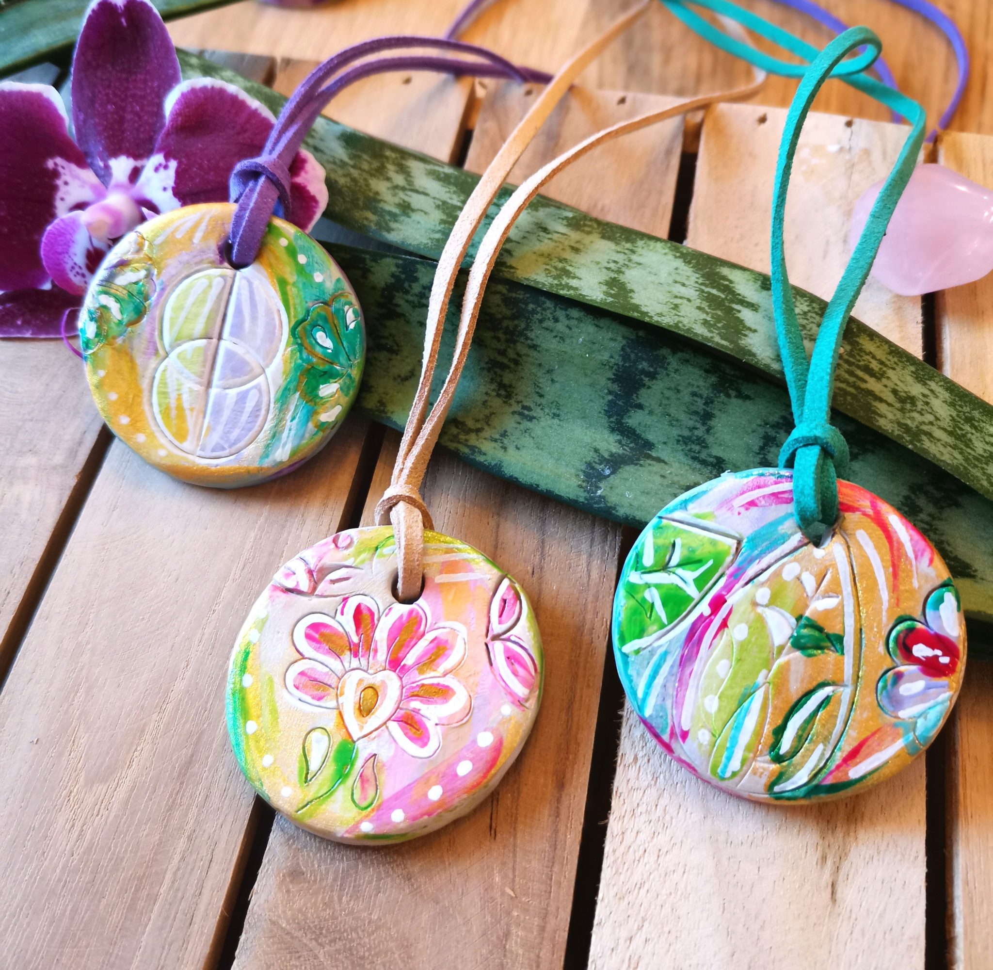 Diese wunderschönen Symbolschmuck Anhänger sind von mir aus Ton handgemacht und bemalt.