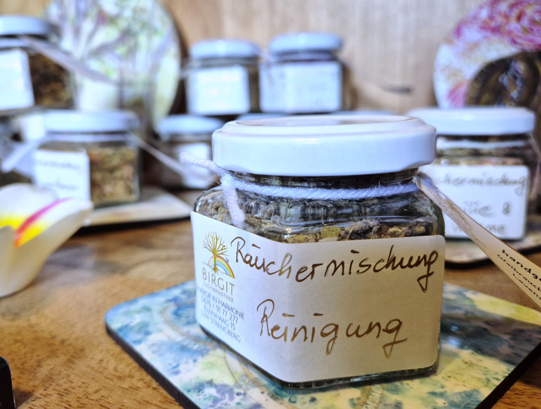 Ich verwende ausschließlich die individuellen und handgefertigten Räuchermischungen von Birgit Gschwandtner, die auch in meinem Online Shop (sh. Bestellformular) bestellt werden können. Räuchermischungen zu folgenden Themen sind erhältlich: Reinigung, Friede & Harmonie, Familie & Wärme, Mut & Vertrauen, Licht & Liebe, Trost & Kraft, Hülle & Fülle, Schutz & Abgrenzung, Frau sein & Weiblichkeit, Zwerglein & Sternchen, Lebensbaum, Magie der Naturwesen, Hüter der Erde, und Atlantis.